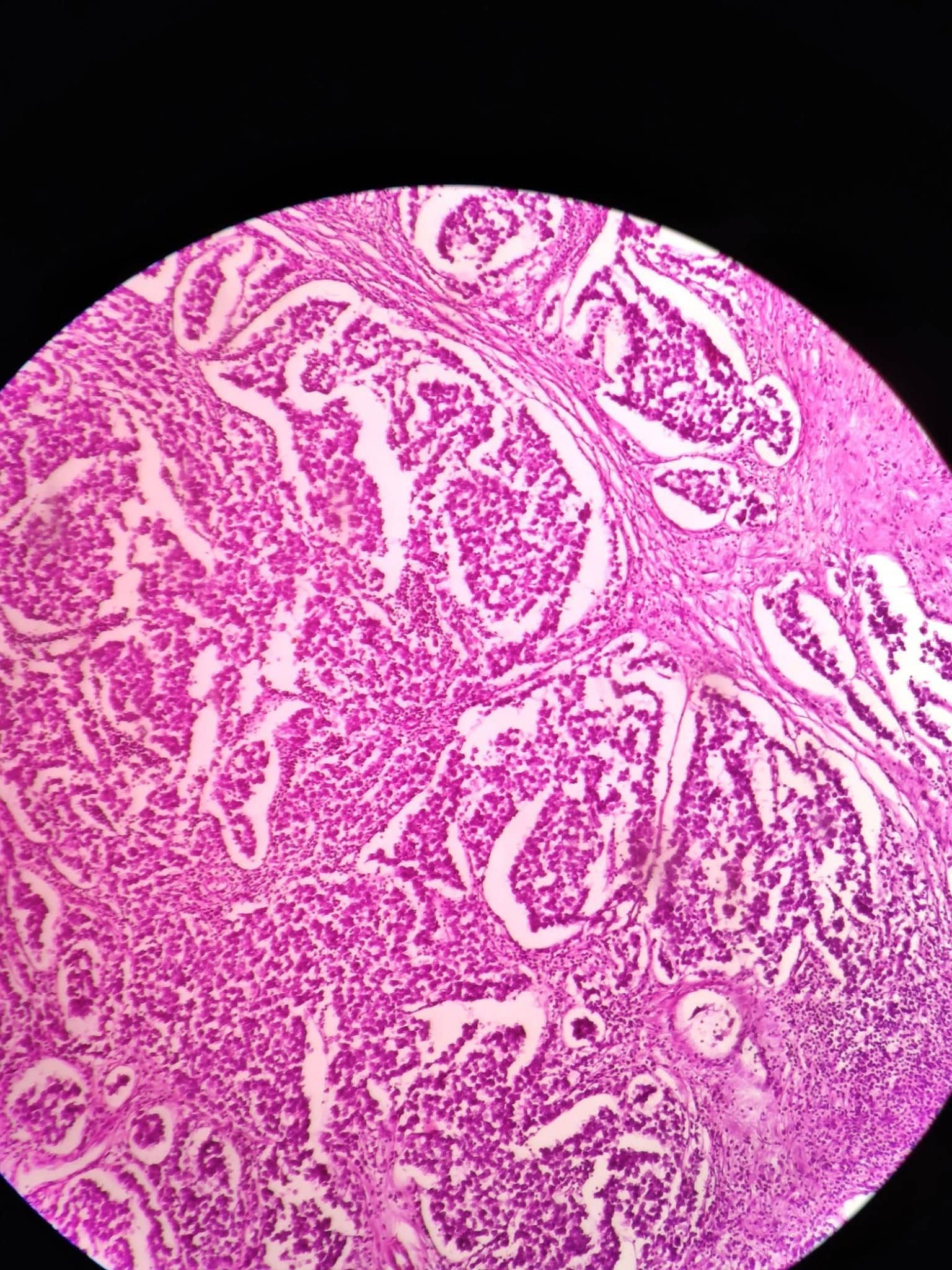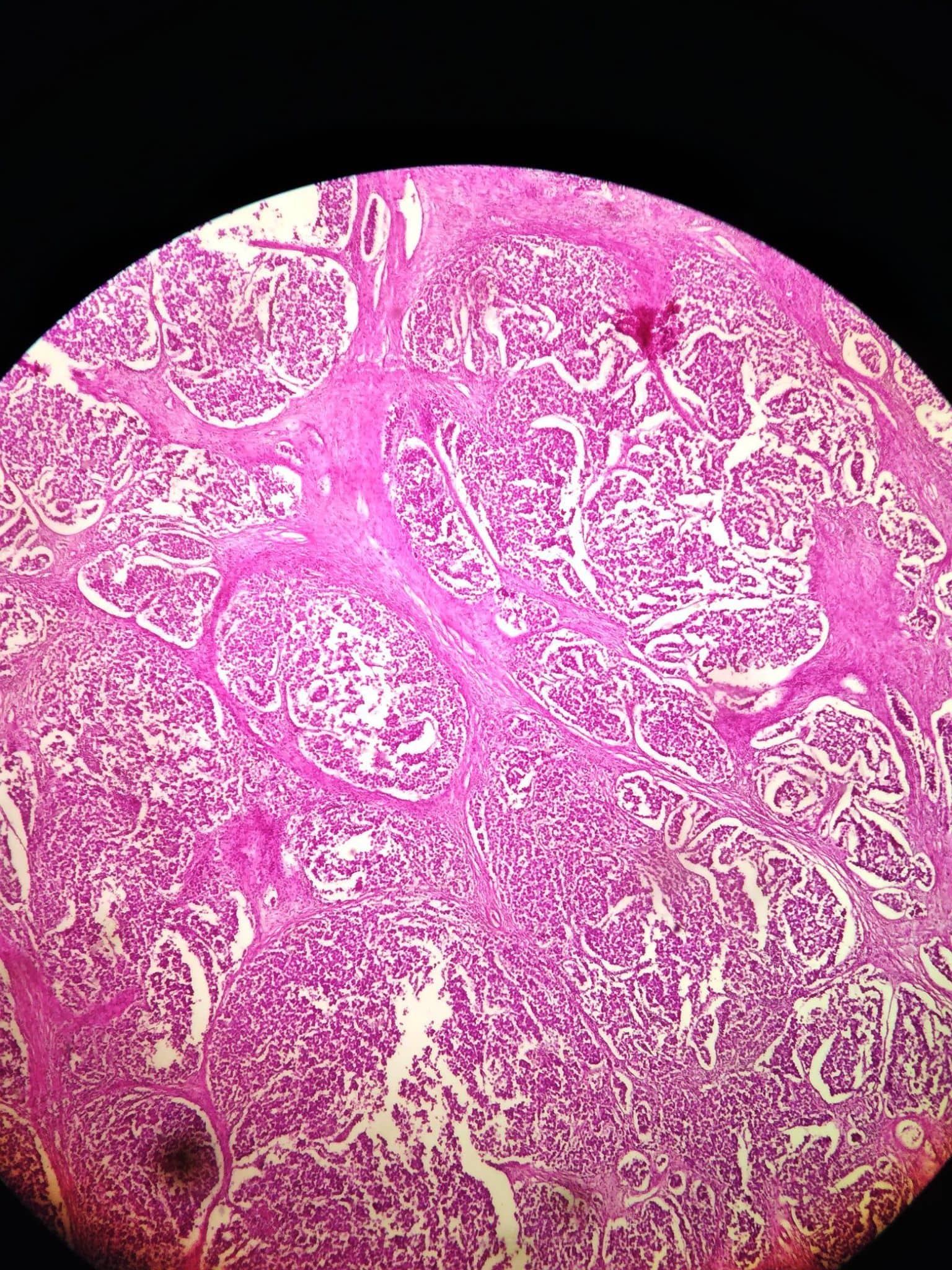 En microscopie, il apparait une prolifération néoplasique de nature germinale lobulée , composée de cellules monotones; le stroma est ponctué d'amas lymphocytaires.