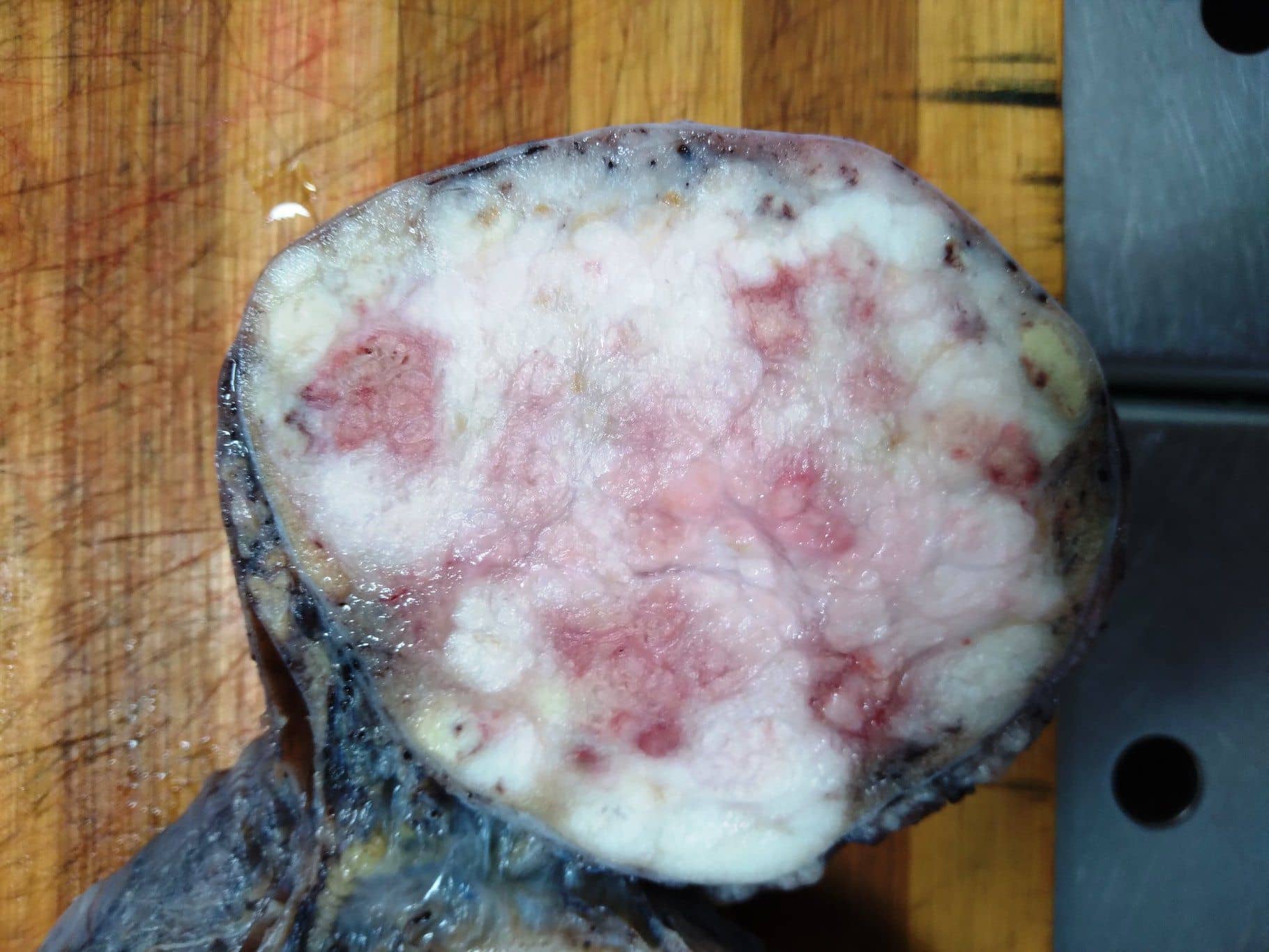 Vous pouvez voir la pièce macroscopique qui montre un processus détruisant toute la pulpe testiculaire et qui demeure distant de la recoupe du cordon spermatique.